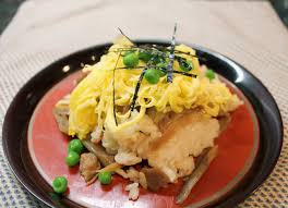 Uma tigela de arroz de sushi com outros ingredientes misturados. Também conhecido como barazushi.